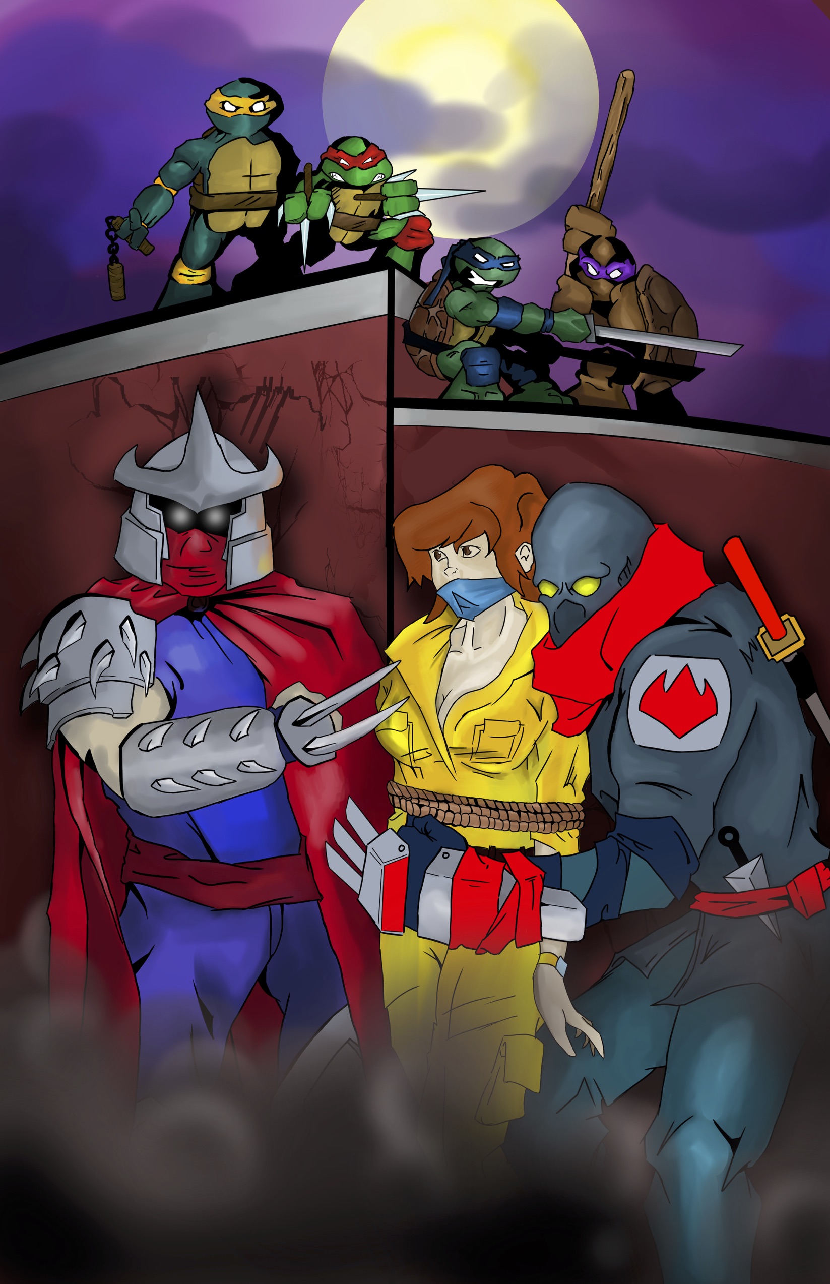 MP: This piece is a little unusual. I saw the cosplay photo in a FaceBook group, TMNT Lives 4 Ever, and I thought it was such an awesome April, Shredder and Foot Soldier that I just had to draw it. The colors were vibrant and it was just very well done. So I sat on that idea for a while until I learned that this year on Free Comic Book Day, there wasn’t going to be a free TMNT title. I found it unacceptable and shot out a message to see who I needed to contact to use the likenesses for the print to give away. Long story short, I did several drafts to get the picture right and ultimately decided to do a hodgepodge of everything I loved about the Turtles. I went with the classic Turtle pose, 80’s April and made the Foot Soldier look a bit more traditional. When it was completed, I found out that the Foot Soldier was actually Dark Leo, from a story line I wasn’t aware of. (But now I want to check it out) So really from start to finish, it was all from the idea of seeing something I visually liked and really just wanted to find a way to give back to the comic and Turtle communities that I have loved since I was a child.